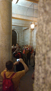 Yes, that's the cathedral behind us. Still being cleaned after at least a year. This is us about 10:30 Saturday morning. We began around 6:00am with great excitement that we were so close to our goal. We were still about 24k away, but that seemed like nothing. So, we started out in silence as we had most days. However, the number of pilgrims began to swell, and as so many joined the flow, it felt more like a parade rather than a hike. Then around 5k from the goal our group broke into song. Well, more like music practice. Matthew W. Dimock, Jr. and Camilo X. Salas-Bowen had arranged to bring the words and music to "Qué Alegría Cuando Me Dijeron." So for almost an hour there was practice. Once we were close, the practice subsided as the excitement grew and distance shrank. Then we reached the outskirts of the city.